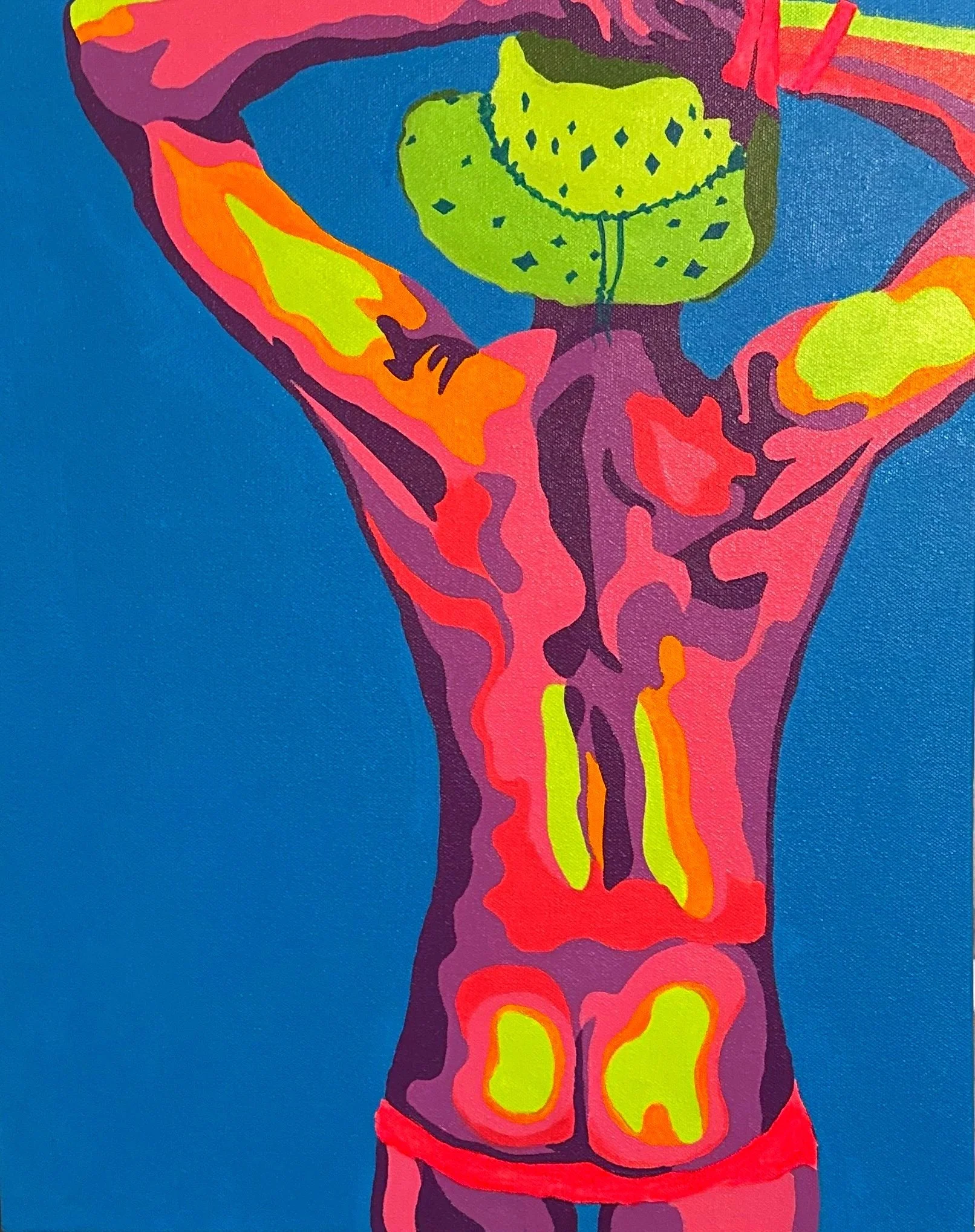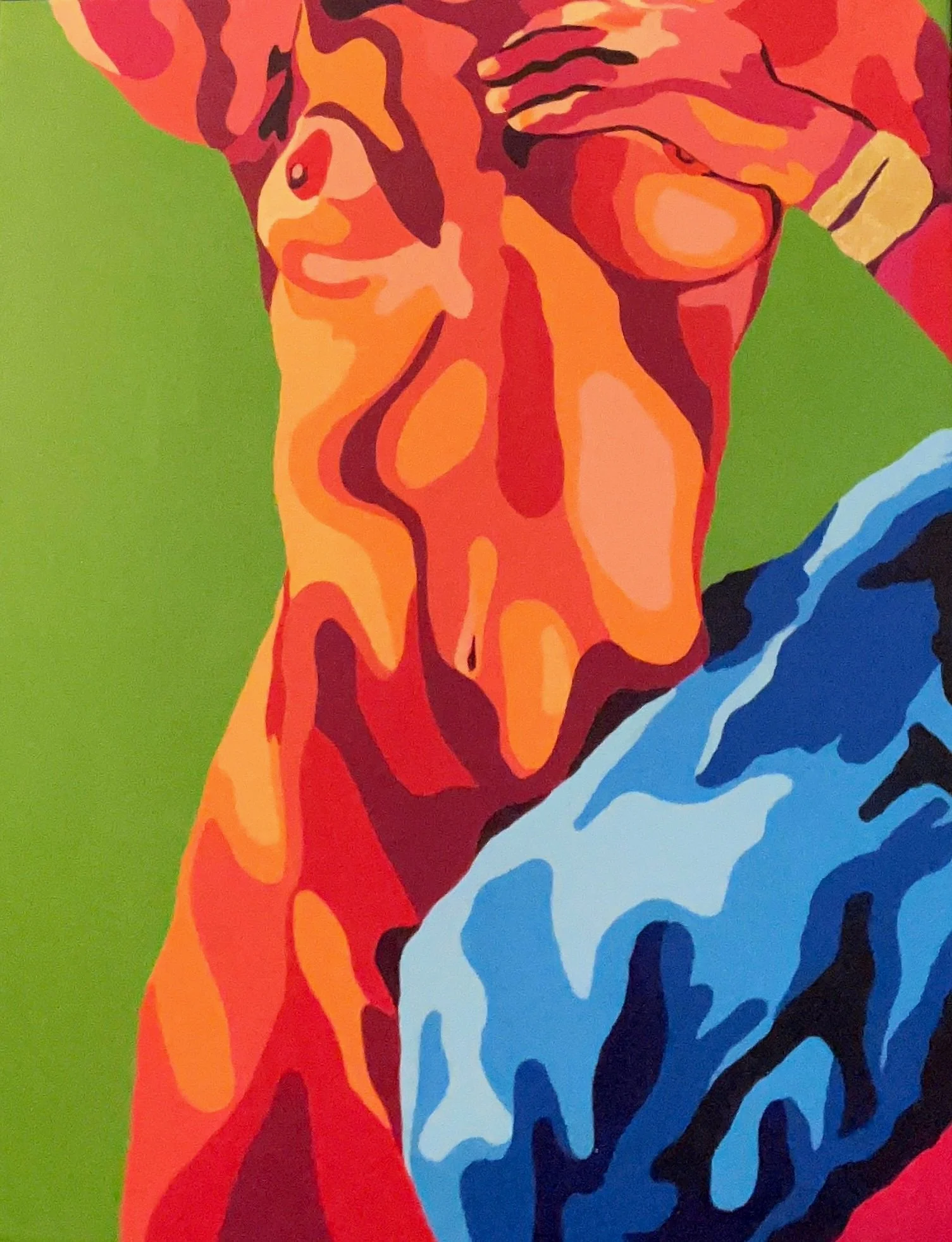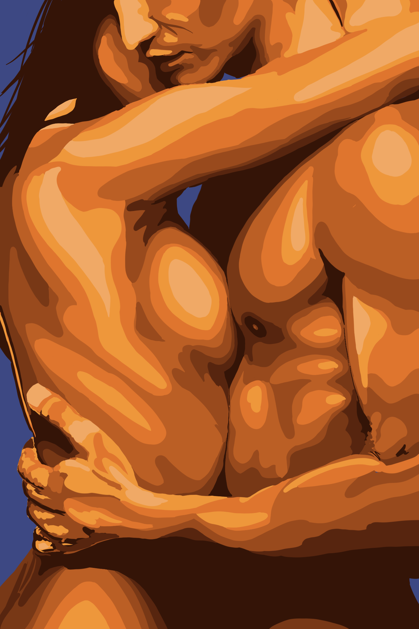 Digital painting of a naked couple embracing in warm, heat map colors.